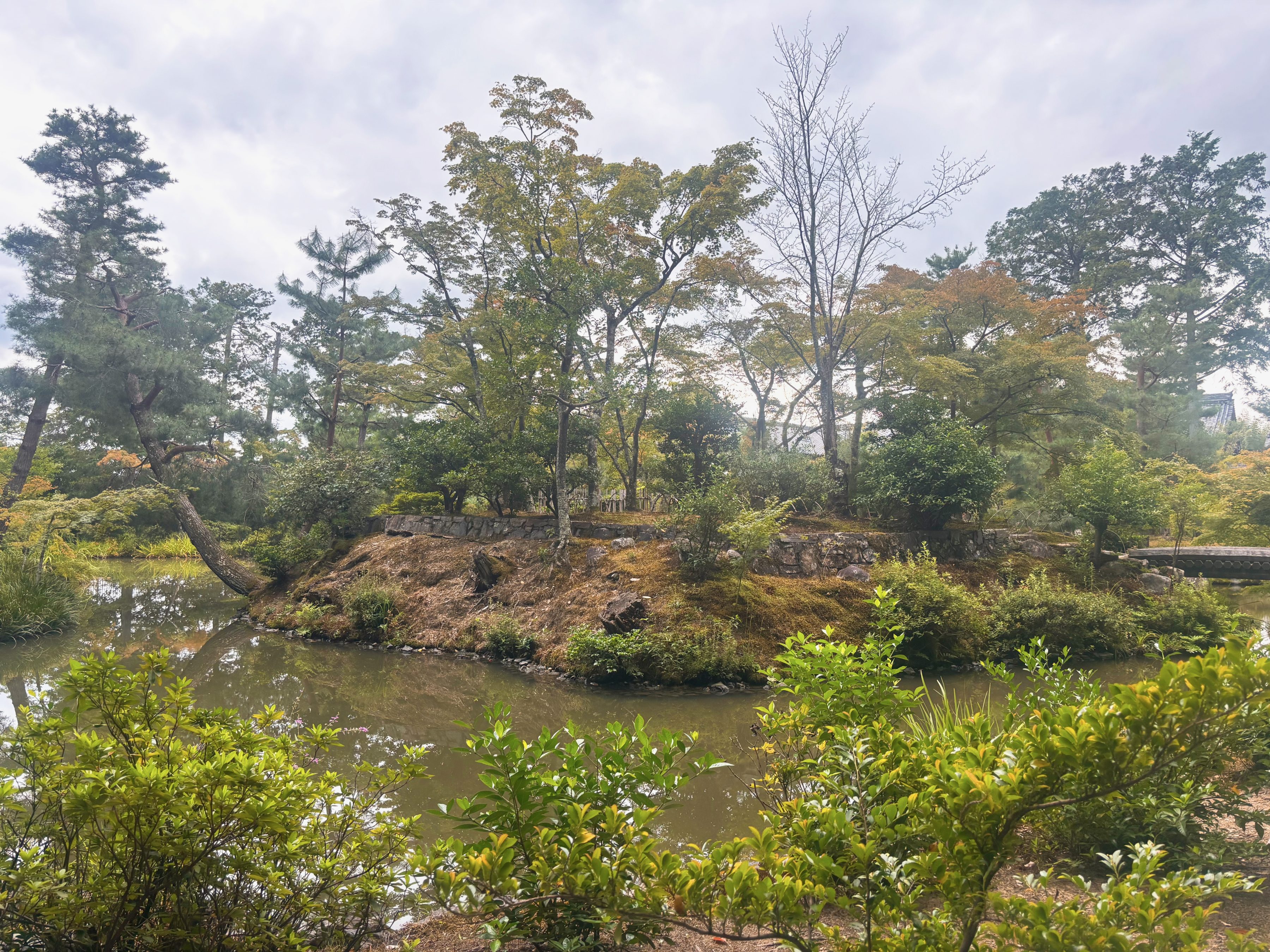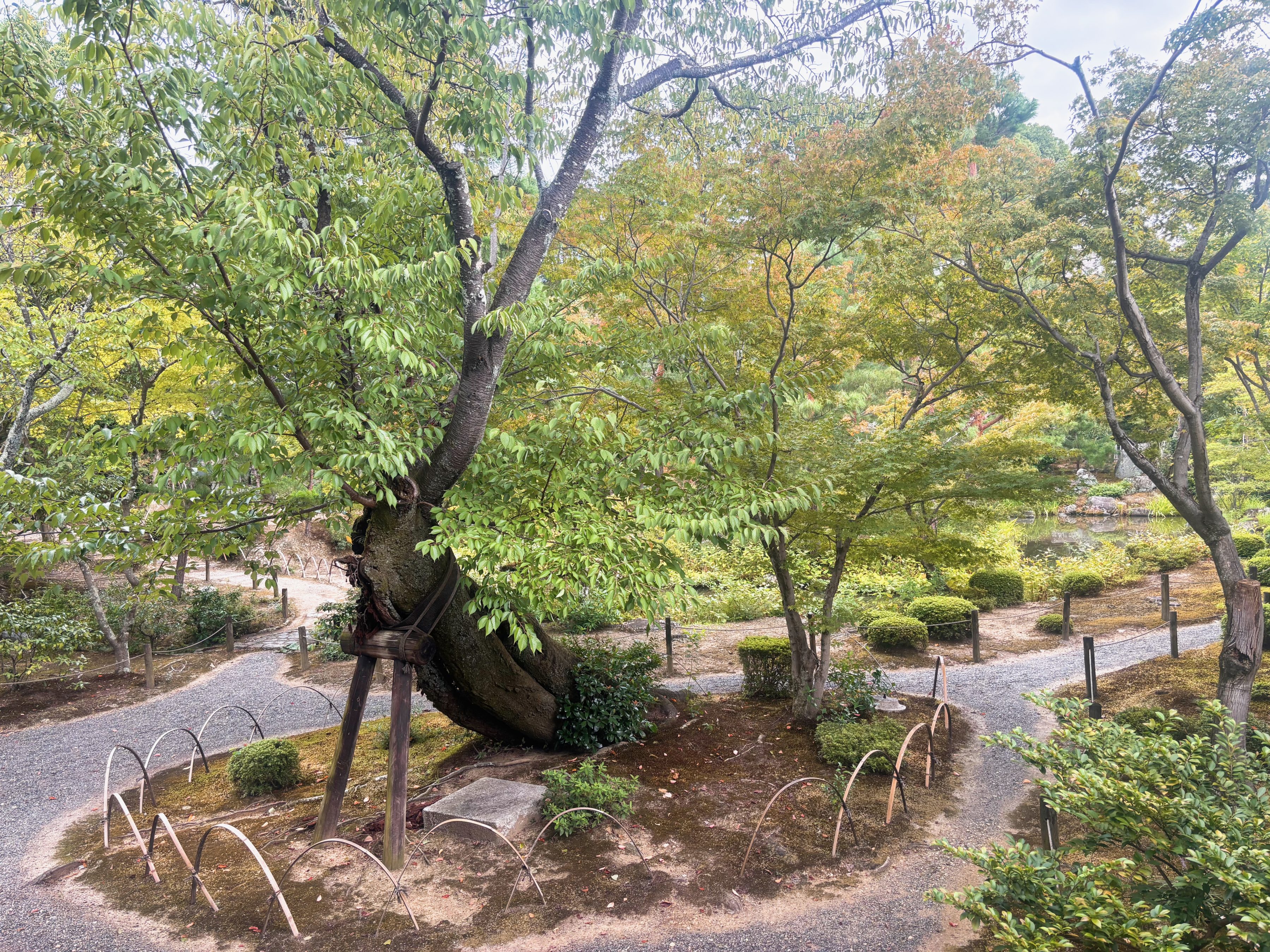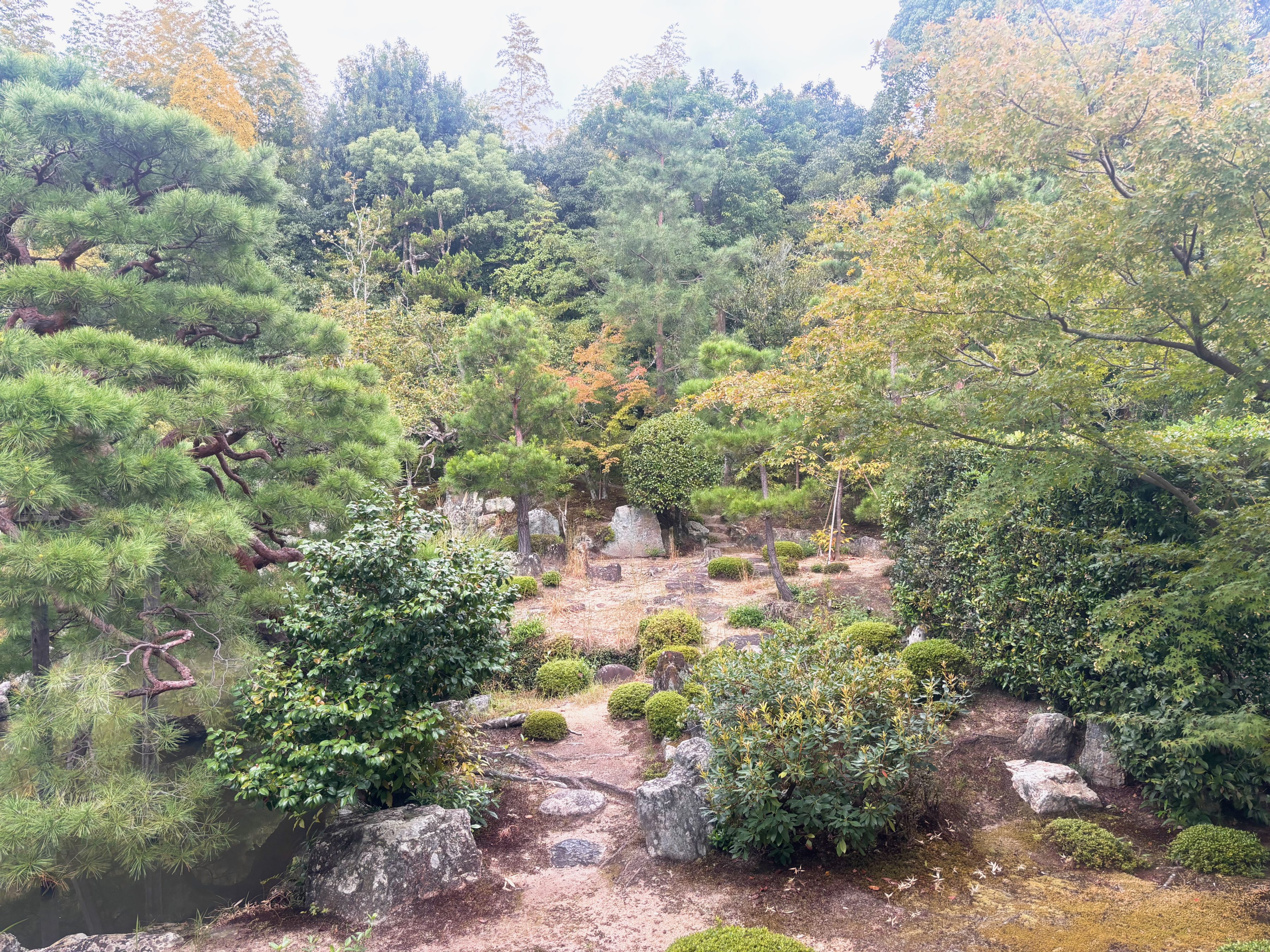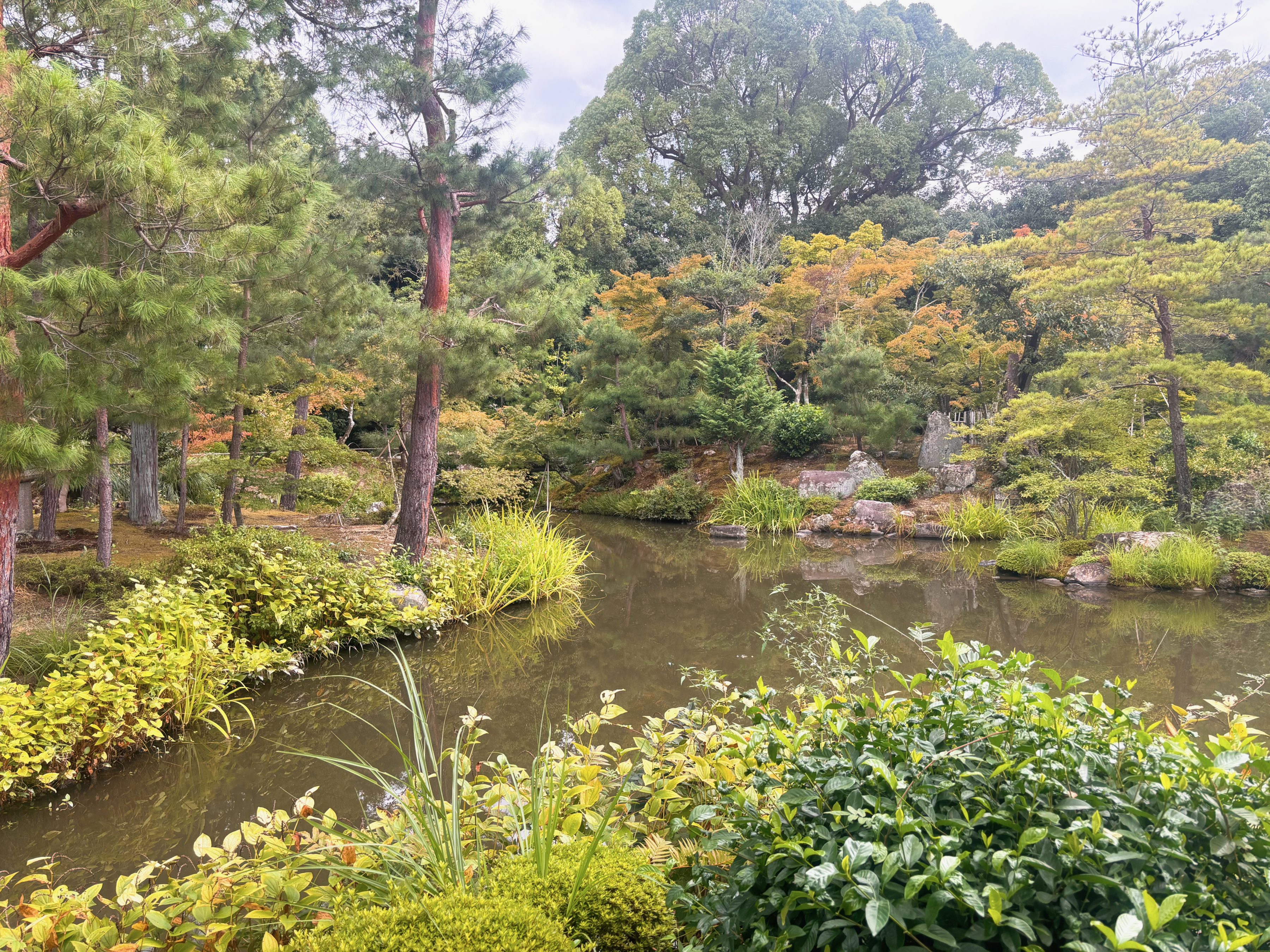 書院から先ほど見たのとは別の庭へ。歩いて回る用のスリッパが用意されている。庭は夢窓国師作伝で結構広さがあり、池を中心とした池泉回遊式庭園だ。この時は他に参拝客がほぼおらず、ゆったりと見て回れた。書院からお茶をいただきながらお庭を眺めることも出来る。素敵やん。