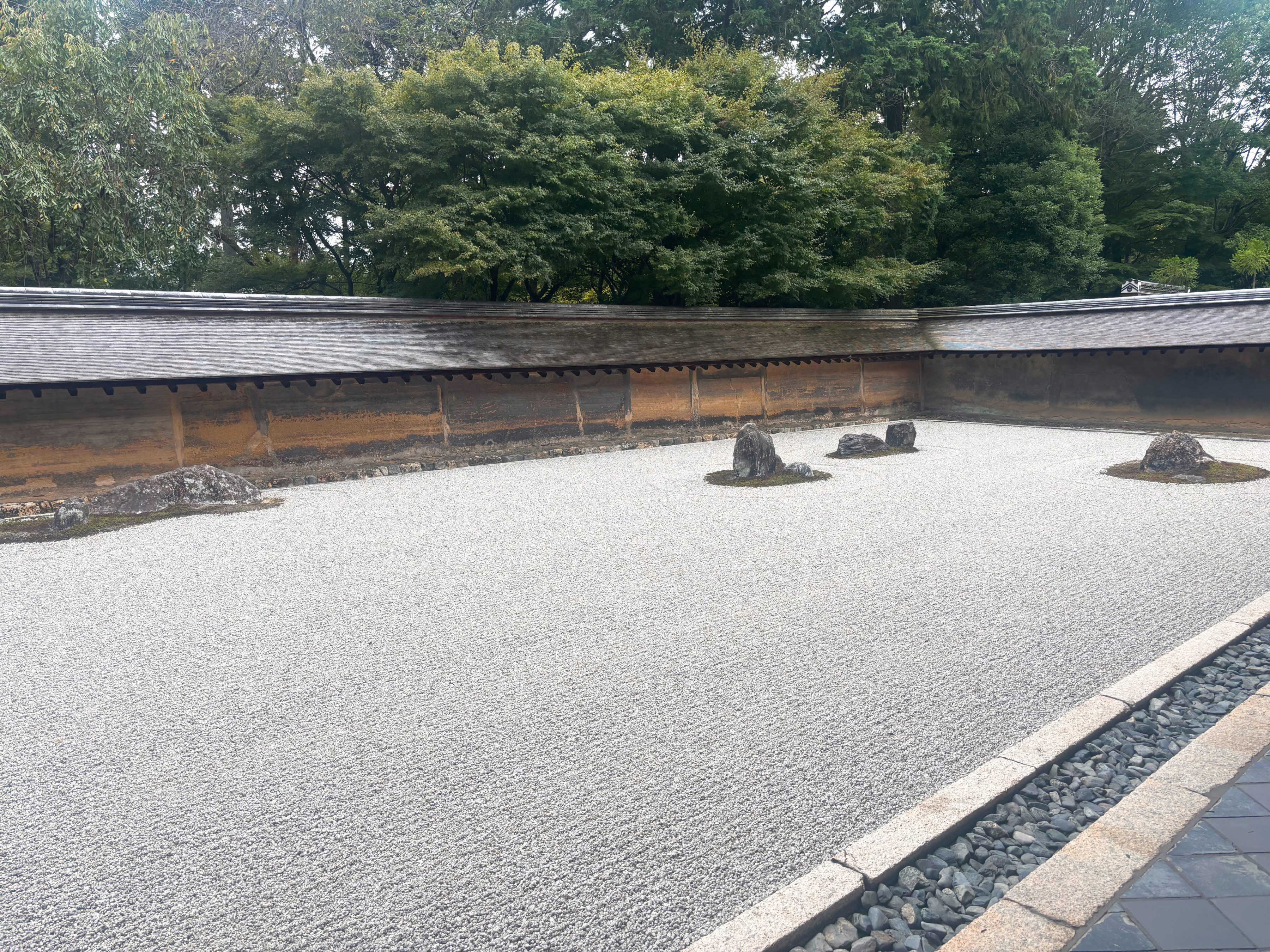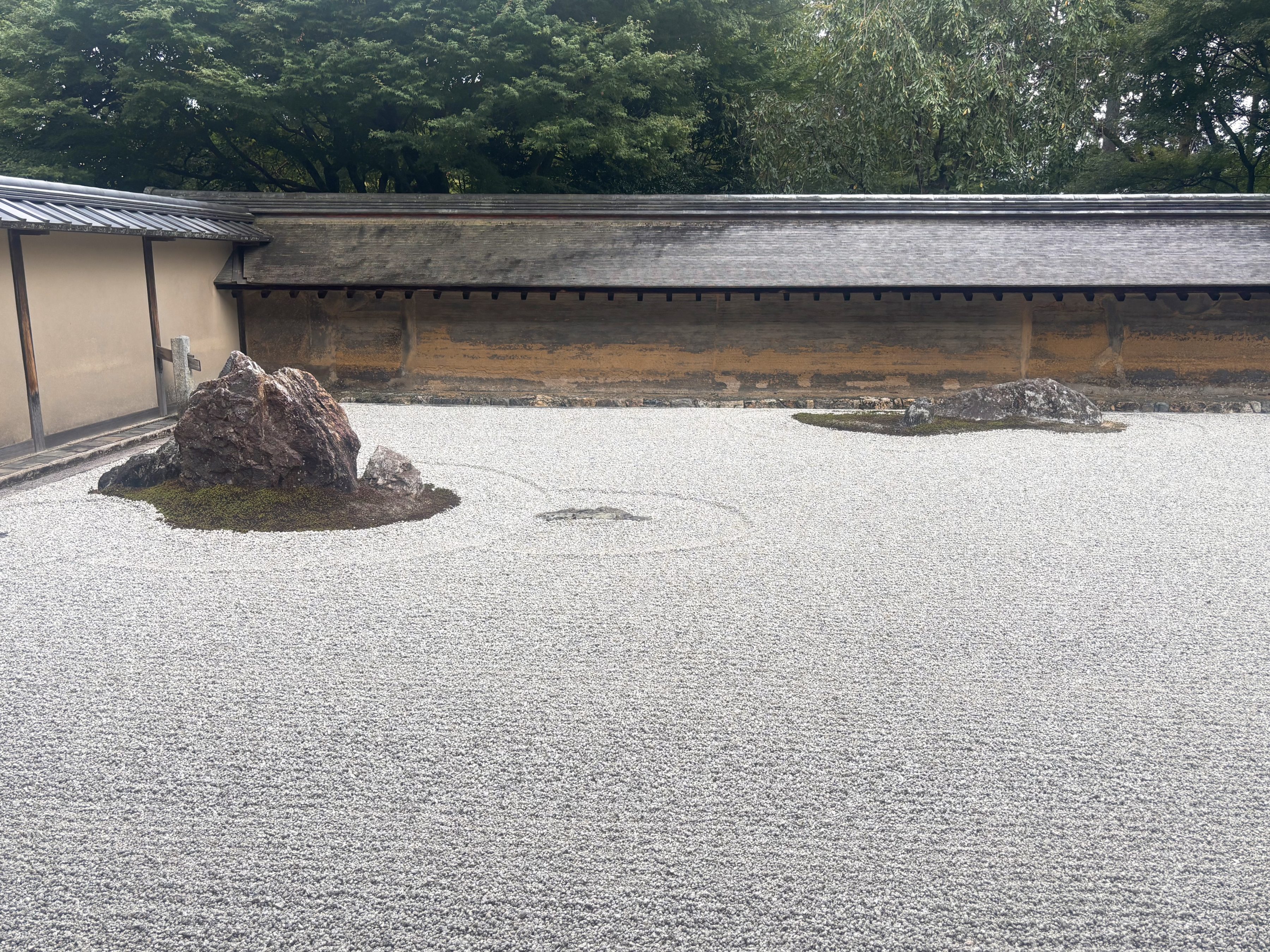 皆この石庭の前に座り込んでしばらくじいと前を見つめていた。何もかも不明なのに、人を引き付ける魅力があるということなのだろうか。確かに、ぱっと見かなりシンプルなのに、ちゃんと奥行のある美しさがある。遠近感だけでなく耐久性にも工夫された作りらしい。不思議なもんだ。