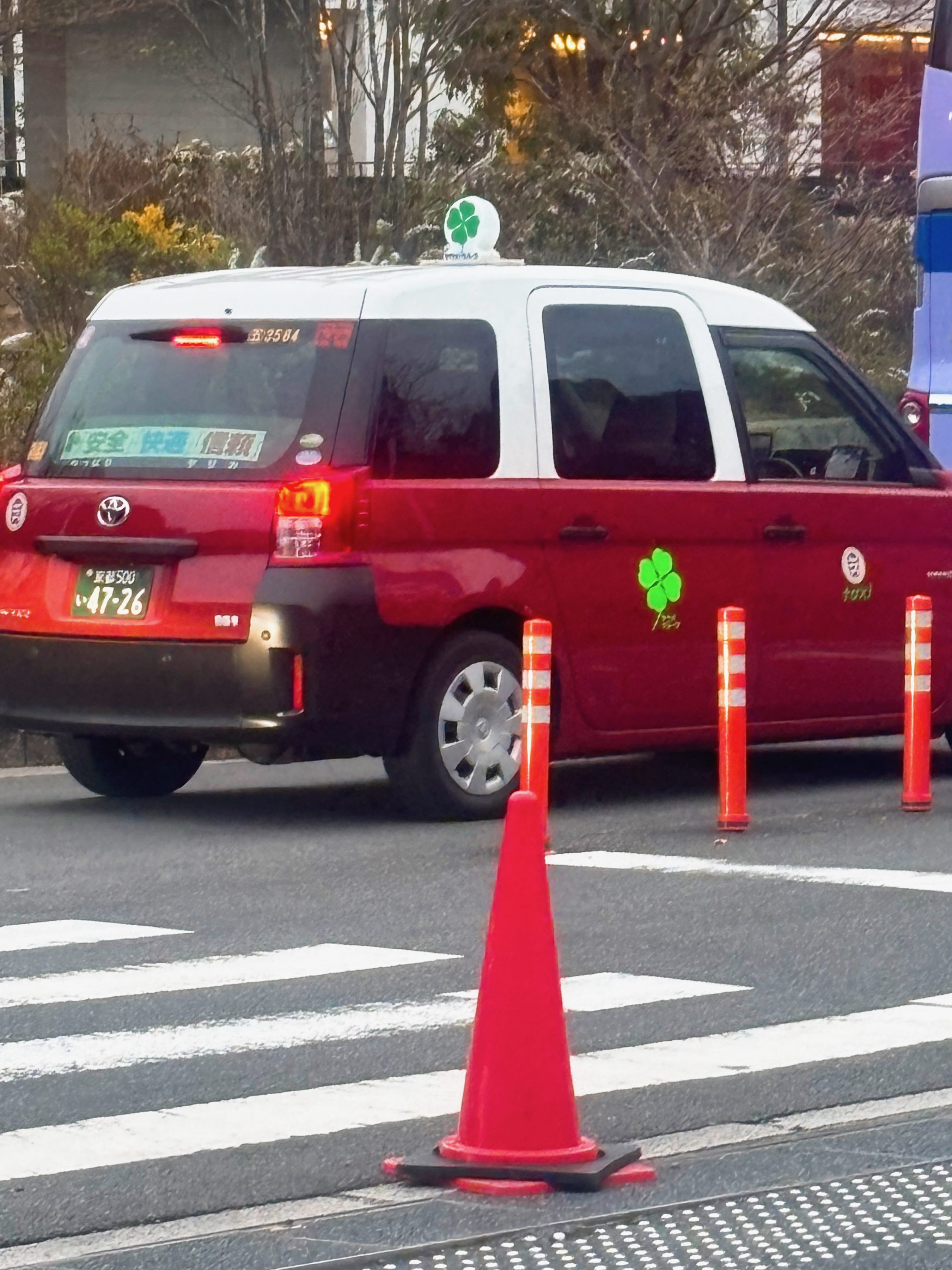 四つ葉タクシーがいました。ヤサカタクシーという会社のタクシーは基本三つ葉のマークなんですが、所有する1300台のタクシーのうち、4台だけがこの四つ葉タクシーらしいです。選ばれた数名のドライバーにより運転されてるとかなんとか。乗車したわけではないんですけど、見かけるのも多分レア。