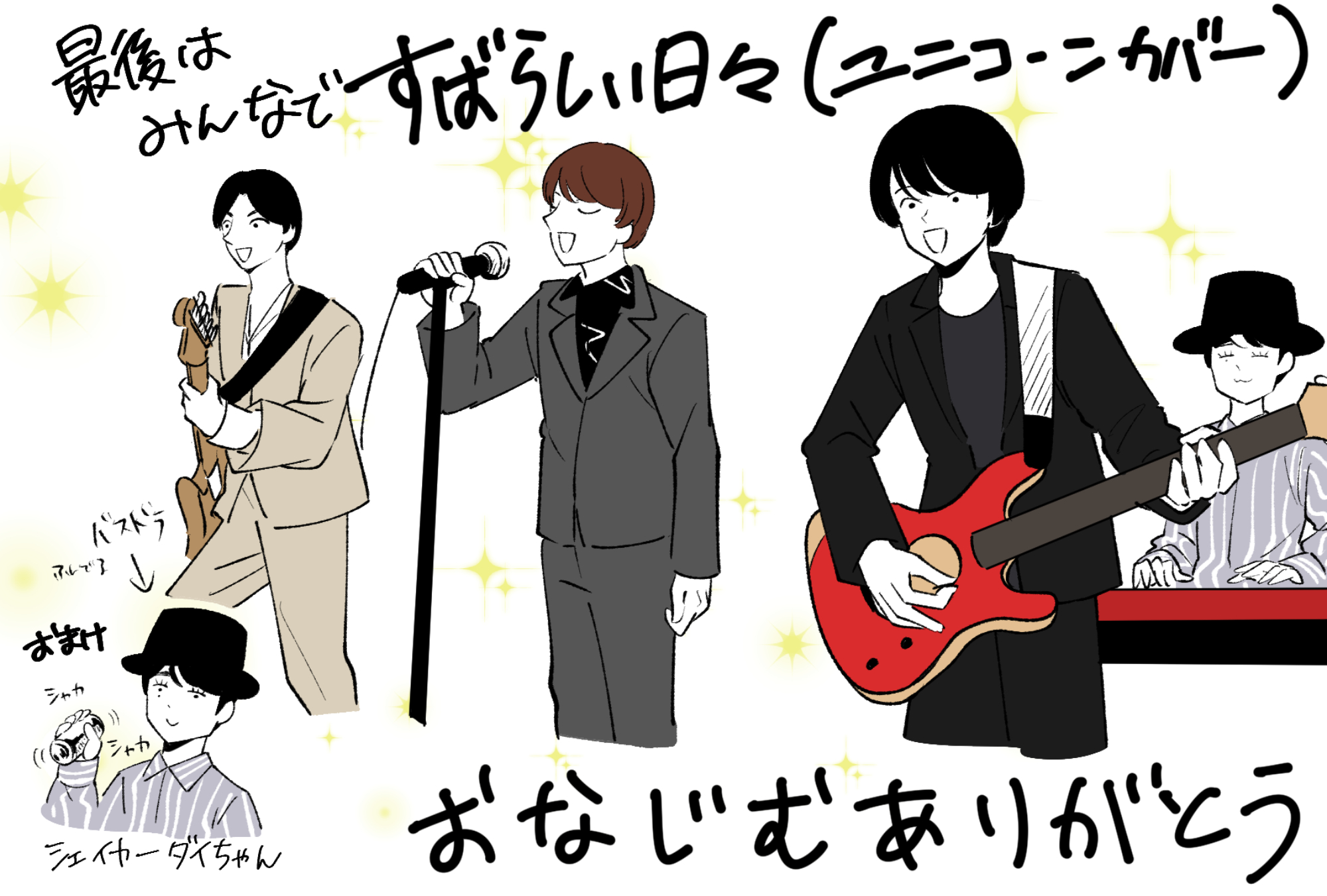 2バンドの絡みと言えば、2017年にフジファブリックが主催した2マンライブ「フジフレンドパーク」のゲストにユニゾンがゲストで出た(私は見てない)。2020年に開催予定だったユニゾン主催の2マンライブ「fun time HOLIDAY8」にフジが出演予定だったが、コロナで開催中止に(私はチケットは持っていた)。あとはすんごい昔に田淵とフジがフットサルしていたらしい、「SMAのド自慢」というイベントで貴雄がフジのサポートドラムしてくれていた(見てない、一生悔やむ)、何故かたまに写真金澤などに現れるユニゾンのメンバー、ユニゾンのライブに行っているらしい山内総一郎。くらいしか知らないのだ。こう書くと多く見えるが、斎藤宏介が金井政人の話をする頻度に比べたら米粒みたいなもんだ。