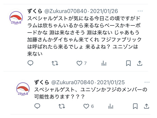 ユニゾン公式アカウントとフジファブリック公式アカウントから同じ内容の投稿がされている。こりゃ本当らしい。本当に?ワァ、フジの投稿に「斎藤宏介 (UNISON SQUARE GARDEN / XIIX)」って書いてあるゥ。いや、何故?????誰の差し金?私、記憶ないけどSMA(Sony Music Artists、2バンドが所属している事務所)の会議に参加していた?そうとしか思えない人選。