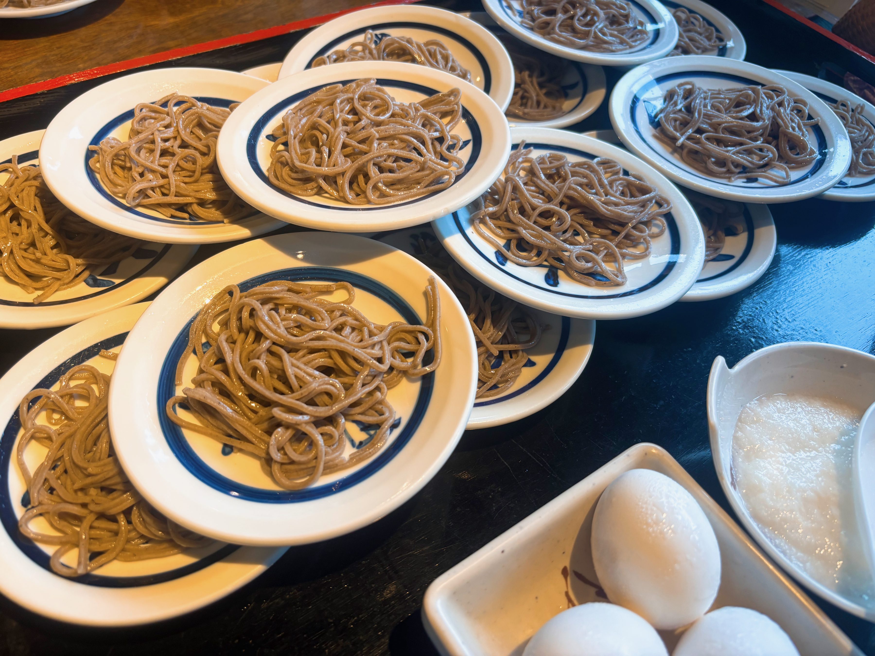 大き目の豆皿に少量ずつそばが盛られており、薬味を足したりや味変しながら一皿ずつ食べていく。何皿だか食べると記念の手形がもらえるそうだ。多分わんこそばの皿版みたいなものだろう。何故こんな食べ方が発展したのかは分からない。出石の名物らしい。私はこれを食った後、腹痛を引き起こす。前述の通り、夕飯でも腹痛になっているのだ。懲りろ。